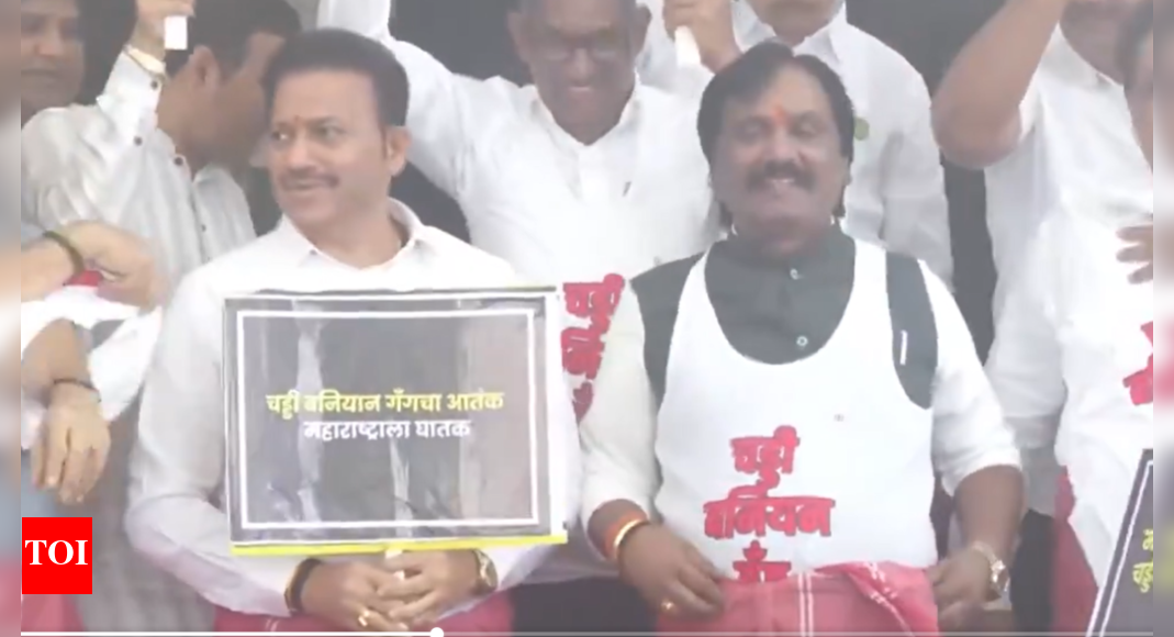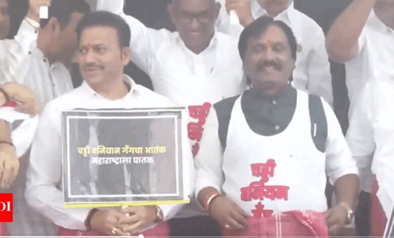 नई दिल्ली: विपक्ष ने बुधवार को शिवसेना के विधायक संजय गिकवाड़ के खिलाफ महाराष्ट्र विधानसभा के बाहर एक अनूठा विरोध प्रदर्शन किया, जो कथित तौर पर बासी भोजन पर एक कैंटीन कार्यकर्ता के साथ मारपीट कर रहा था।विपक्षी विधायक विधानसभा की सीढ़ियों पर इकट्ठा हुए, वेस्ट और तौलिए पहने हुए, और “हम चड्डी-बानियन गिरोह की निंदा करते हैं।”शिवसेना (यूबीटी) के नेता आदित्य ठाकरे के बाद यह विरोध आया कि शिवसेना के विधायक संजय गाइकवाड़ और संजय शिरसत में एक घूंघट जाब लिया गया, जिसमें उन्हें “चदी-बानियन गैंग” के हिस्से के रूप में संदर्भित किया गया।“वे जो कुछ भी करना चाहते हैं, क्योंकि डर नहीं है,” ठाकरे ने कहा।जिब ने वायरल वीडियो का उल्लेख किया, जिसमें एक बनियान और तौलिया पहने हुए बुल्दना के विधायक संजय गाइकवाड़ को कथित तौर पर बासी दल के ऊपर एक कैंटीन कार्यकर्ता के साथ शारीरिक रूप से हमला करते देखा गया था।पिछले हफ्ते, गायकवाड़ ने कथित तौर पर एक कर्मचारी को पछाड़ दिया और मुंबई के कोलाबा में आकाशवानी विधायकों की हॉस्टल कैंटीन में एक दूसरे को छुड़ाया। इस घटना ने न केवल विपक्ष से, बल्कि सत्तारूढ़ गठबंधन से भी मजबूत निंदा की, जिसमें मुख्यमंत्री देवेंद्र फडणवीस और डिप्टी सीएम एकनाथ शिंदे शामिल थे।इस घटना के बाद, मुंबई पुलिस ने गाइकवाड़ के खिलाफ एक गैर-संज्ञानात्मक अपराध दर्ज किया। इसके अतिरिक्त, खाद्य और औषधि प्रशासन (एफडीए) ने कैंटीन ठेकेदार के लाइसेंस को निलंबित कर दिया।इस बीच, एक अन्य शिवसेना के विधायक, संजय शिरसत को विवाद का सामना करना पड़ा, एक वीडियो सामने आने के बाद उसे एक कमरे में बैठे एक आंशिक रूप से खुले बैग के साथ दिखाया गया जिसमें मुद्रा नोटों के बंडलों को शामिल किया गया था। शिरत ने आरोपों को खारिज कर दिया, वीडियो को “अच्छी तरह से सोचा-समझा साजिश” कहा।