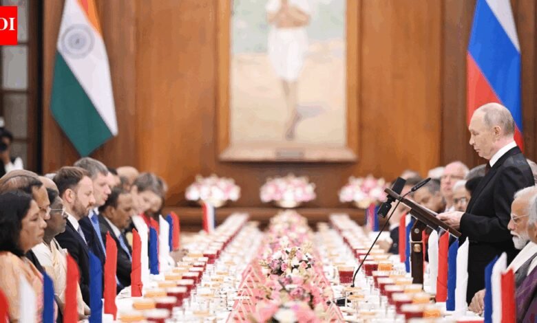 नई दिल्ली: राष्ट्रपति Droupadi Murmu रूसी राष्ट्रपति की मेजबानी की व्लादिमीर पुतिन अपनी भारत यात्रा के दूसरे दिन एक भव्य राजकीय भोज के लिए राष्ट्रपति भवन में, जिसमें ताजी सामग्री और सुगंधित मसालों से बनी पारंपरिक थाली के रूप में प्रस्तुत एक पूर्ण-शाकाहारी मेनू शामिल था। सावधानी से तैयार किया गया यह प्रसार हल्का, सुरुचिपूर्ण और उत्सवपूर्ण रहते हुए भारत की क्षेत्रीय विविधता और पाक विरासत को उजागर करने के लिए डिज़ाइन किया गया था।