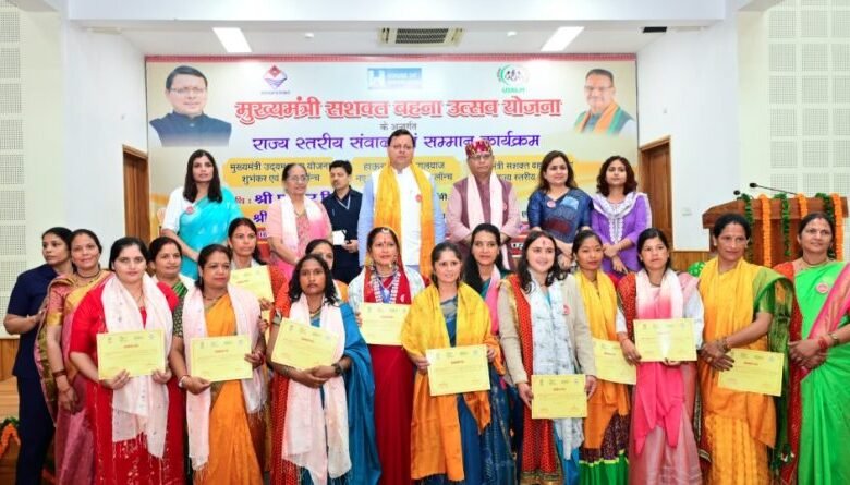 देहरादून। मुख्यमंत्री पुष्कर सिंह धामी ने मुख्यमंत्री आवास स्थित मुख्य सेवक सदन में मुख्यमंत्री सशक्त बहना उत्सव योजना के अन्तर्गत सराहनीय कार्य करने वाले महिला स्वयं सहायता समूहों को सम्मानित किया और उनसे संवाद भी किया। इस अवसर पर मुख्यमंत्री ने मुख्यमंत्री उद्यमशाला योजना का शुभंकर एवं लोगो लॉन्च किया तथा हाउस ऑफ हिमालयाज के नये उत्पाद एवं वेबसाइट का लोकार्पण किया।