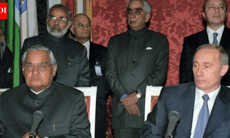 नई दिल्ली: जैसे ही रूसी राष्ट्रपति व्लादिमीर पुतिन प्रधानमंत्री नरेंद्र मोदी के साथ बहुप्रतीक्षित बैठक के लिए भारत आने की तैयारी कर रहे हैं, दोनों नेताओं की पुरानी तस्वीरें ऑनलाइन फिर से सामने आ गई हैं।2001 में मॉस्को में ली गई तस्वीरों में मोदी – तत्कालीन गुजरात के मुख्यमंत्री – को तत्कालीन प्रधान मंत्री के साथ दिखाया गया है अटल बिहारी वाजपेयी एक आधिकारिक दौरे के दौरान. एक दस्तावेज़-हस्ताक्षर समारोह के दौरान कैप्चर किए गए दृश्य पहली बार पिछले साल वायरल हुए थे जब मोदी ने रूस की यात्रा की थी, और पुतिन की भारत यात्रा से पहले सोशल मीडिया पर फिर से दिखाई दिए हैं।