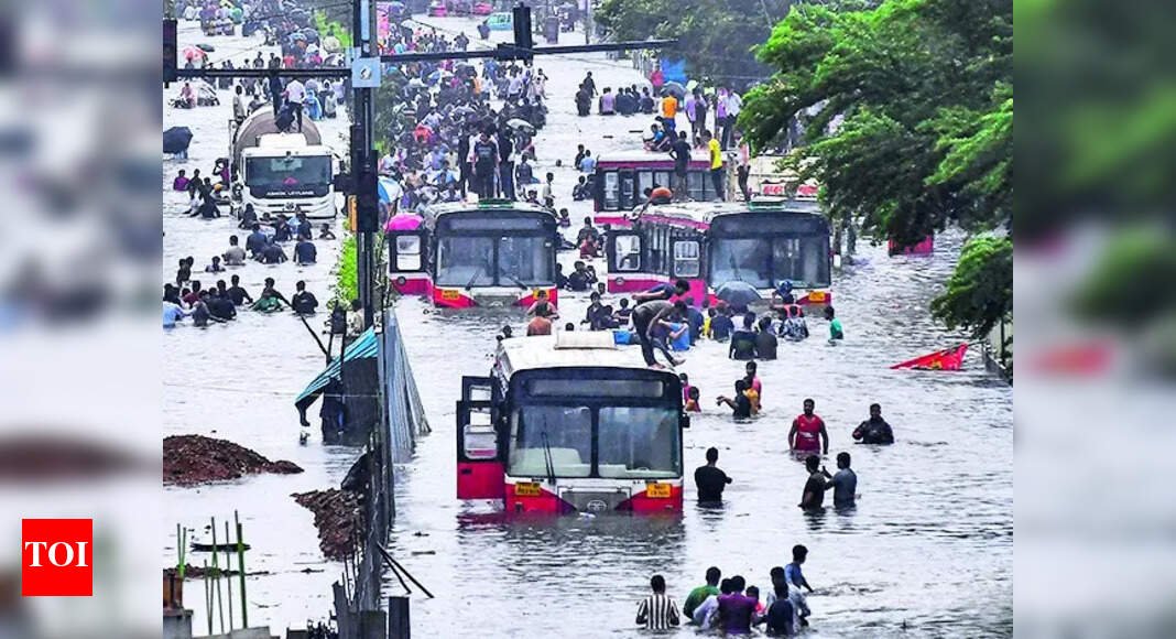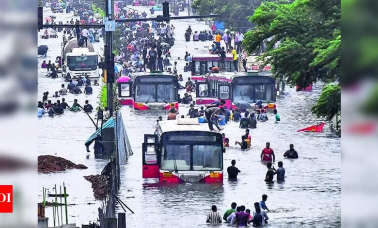 मुंबई: मंगलवार की भारी बारिश, जिसने आईएमडी के लाल अलर्ट को सही ठहराया, सोमवार से अधिक मुंबई को अपंग कर दिया, मिथी नदी के आसपास के निचले इलाकों के 400 निवासियों के साथ पानी के स्तर के बढ़ने के बाद खाली कर दिया गया, कई सड़कों के जलप्रपात, 11 उड़ानों को अन्य हवाई अड्डों पर ले जाया गया और 24 आगमन उड़ानों को ‘गो-अराउंड’ करने के लिए मजबूर किया गया। भांडुप में एक जीवित तार के संपर्क में आने के बाद एक व्यक्ति को इलेक्ट्रोक्यूट किया गया था।स्कूलों के लिए नागरिक अवकाश और शहर में हल्के यातायात ने हताहतों की संख्या को सीमित करने में मदद की।यह पांच साल में मुंबई का सबसे बड़ा अगस्त बन गया है। कई क्षेत्रों में 24 घंटे में 300 मिमी से अधिक बारिश हुई, जिसमें चिनचोली मलाड में 361 मिमी की रिपोर्टिंग की गई। पांच-दिवसीय गीले स्पेल (मंगलवार को 15 अगस्त से 8.30 बजे तक 8.30 बजे तक) के दौरान, मुंबई ने 837.3 मिमी प्राप्त की, जिसमें से तीन में से तीन दिनों के करीब 200 मिमी से अधिक या प्रत्येक के करीब। बुधवार को जारी रहने की संभावना है, आईएमडी मुंबई के लिए नारंगी अलर्ट जारी करने के साथ; गुरुवार से राहत की उम्मीद है जब एक पीले रंग की चेतावनी का संकेत दिया जाता है।मंगलवार को गोरेगांव में ओबेरोई मॉल के विपरीत, कुछ लोगों को बाढ़ के पानी में तैरते हुए देखा गया। विकरोली और भांडुप में भूस्खलन-प्रवण सूर्य नगर के निवासियों को पास के एसआरए इमारतों में ले जाया गया।भांडुप में, एक व्यक्ति को एलबीएस मार्ग में एक लाइव तार के संपर्क में आने के बाद इलेक्ट्रो किया गया था। पुलिस ने क्षेत्र से बाहर कर दिया और अधिक हताहतों को रोकने के लिए बिजली की आपूर्ति को बंद कर दिया। उन्होंने कहा कि एक ओवरहेड तार पानी में गिर गया था और चिंगारी देखी गई थी। पोइसर सबवे और मलाड सबवे ने जलप्रपात किया और यातायात के लिए बंद कर दिया गया। मलाड में, मोटर चालकों को MTNL जंक्शन पर ले जाया गया। हिंदमाता, दादर टीटी, ट्रॉम्बे, महाराष्ट्र नगर सबवे, एंटोप हिल, सरदार नगर, प्रातिकशा नगर, गांधी बाजार और भियोवाड़ा में जल्लॉगिंग के कारण यातायात आंदोलन धीमा था। इसके अलावा, कुर्ला, वडाला, सेरी और बायकुल्ला ने सड़क के व्यवधानों को देखा।सेंट्रल रेलवे यात्रियों को सायन-कुरला-चुनाभट्टी में जलभराव के रूप में कठिनाइयों का सामना करना पड़ा, जिससे हार्बर लाइन को निलंबित कर दिया गया। पश्चिमी रेलवे ट्रेनें देरी से जुड़ी।सुबह के उच्च ज्वार के बीच, मिथी के आसपास के निचले क्षेत्रों के 400 निवासियों को निकाला गया क्योंकि जल स्तर 3.9 मीटर तक बढ़ गया, जो नदी के खतरे के 4.2 मीटर के खतरे के निशान के करीब था। 85 करोड़ रुपये की लागत से 14 जून को खोला गया विकरोली फ्लाईओवर था। बीकेसी मेट्रो स्टेशन पर बारिश के रिसाव में पहुंची, ले