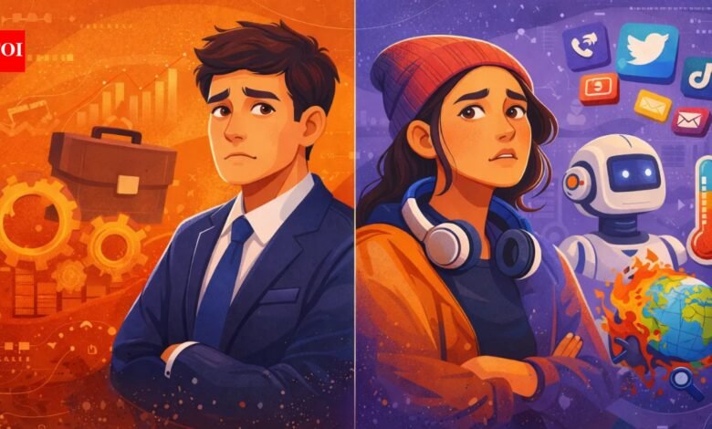 If millennials fear instability after effort, Gen Z fears never reaching stability at all.Jobs exist, but they feel temporary. Career paths are fragmented. Contract work, automation and AI-driven tools have reshaped expectations. According to the World Economic Forum’s Future of Jobs Report, routine cognitive roles are among the most vulnerable globally – a warning that resonates strongly in India’s IT- and services-driven economy.“Earlier, you worried about placements. Now you worry about layoffs every quarter,” said Rohan Mehta, a 27-year-old software developer in Pune.Many Gen Z professionals describe being pushed into a constant survival mode.“As a Gen Z Indian, I fear a future where people are stuck in mediocrity. Where jobs exist but do not grow, skills plateau early, and effort leads to survival, not progress,” said Srishti Singh, who works at an advertising agency in Mumbai.“This is a loop, no solution. I had to join the rat race,” added Rhea Duara, a media executive in Delhi, describing how career uncertainty has merged with mental exhaustion.She said, “Career. The fact that I jumped into the job life so quickly because everyone my age was doing so but I completely forgot about continuing my studies. No MA… we jump into jobs quickly only to realize we don’t have the maturity to deal with stuff, stuff like office politics.”For Gen Z, adulthood feels rushed, unstructured and unforgiving.
