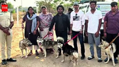 हैदराबाद: चिलचिलाती धूप में हैदराबाद के बाहरी इलाके में एक गांव की सड़क पर घूम रहे पांच लावारिस साइबेरियन हस्कियों…
