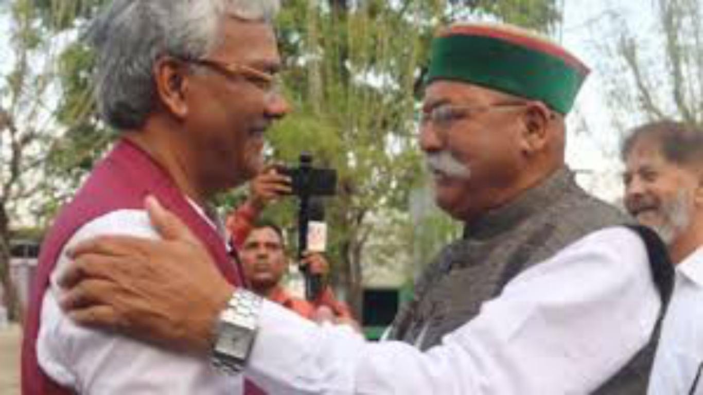 त्रिवेंद्र सिंह रावत और जोत सिंह गुनसोला मतगणना स्थल पर लगे गले